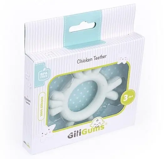 Ten silikonowy gryzak w kształcie sympatycznego kurczaka będzie doskonałym towarzyszem dla każdego maluszka. Jego niezwykły design wpłynie pozytywnie na rozwój zmysłów dziecka. Zróżnicowana faktura produktu pozwala na łatwe trzymanie go przez małe rączki, a jednocześnie delikatnie masuje dziąsła podczas ząbkowania. Pastelowy odcień jasnomięty sprawia, że gryzak staje się także modnym dodatkiem.
