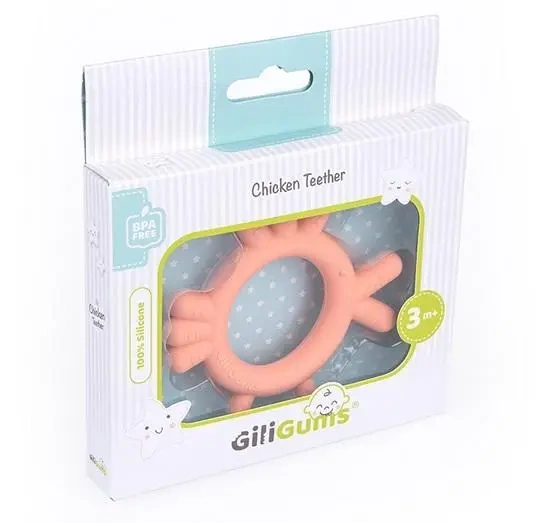 Oto uroczy, silikonowy gryzak w kształcie kurczaka, który przyniesie ukojenie dla obolałych dziąseł Twojego malucha podczas ząbkowania, a jednocześnie dostarczy mu wiele radości z zabawy! Dzięki zróżnicowanym fakturkom, gryzak delikatnie masuje dziąsła dziecka, kiedy go gryzie. Bardzo praktyczny kształt kurczaczka sprawia, że gryzak idealnie pasuje do małych rączek malca. Bezpieczne, łatwe w utrzymaniu czystości i trwałe silikonowe tworzywo, z którego zaróbiony został gryzak, to dodatkowy atut tego produktu.