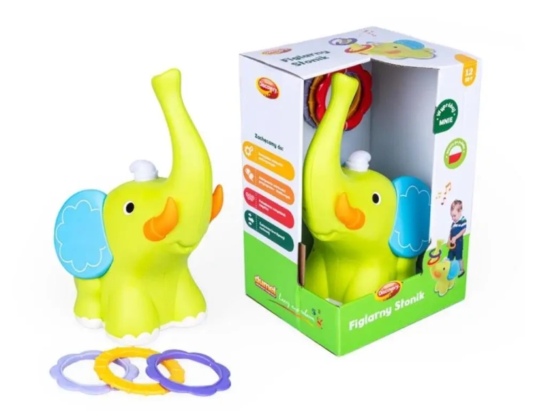Spróbuj swoich sił i poćwicz celność z Figlarnym Słonikiem! W zestawie otrzymujesz kolorowe obręcze, które musisz próbować wrzucić na ruchomą trąbę słonia. Słonik rusza się we wszystkich kierunkach, co znacznie utrudnia zadanie. Aby rozpocząć zabawę, wystarczy nacisnąć czapeczkę słonika, posłuchać piosenki w języku polskim i zacząć ćwiczyć swój rzut!