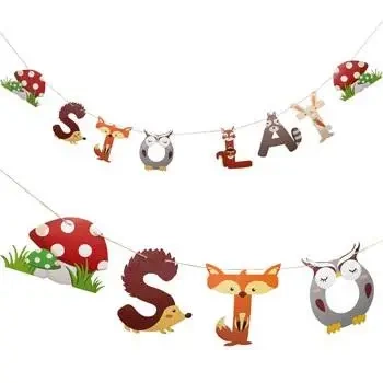 Papierowa girlanda na sznurku, ozdobiona motywem zwierząt z lasu, tchnie radością i uroczym klimatem. Zwierzęce postacie tworzą napis "sto lat", co czyni ją idealną dekoracją na dziecięce przyjęcia urodzinowe. Dzięki temu oryginalnemu elementowi, urodzinki najmłodszych nabiorą wyjątkowego charakteru.