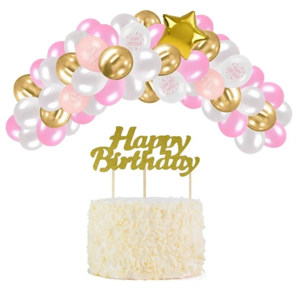 - 34 balony lateksowe w kolorach różowym (x17) i białym (x17), o wielkości 25 cm każdy - 6 balonów lateksowych z nadrukiem z napisem "Happy Birthday", w kolorach różowym (x3) i białym (x3), również o wielkości 25 cm - 10 balonów lateksowych z efektem chromu w kolorze złotym, o wymiarach 30 cm każdy - balon foliowy w kształcie gwiazdki w kolorze złotym, mający 45 cm średnicy - topper na tort urodzinowy z napisem "Happy Birthday", podkreślający wyjątkowy charakter uroczystości. Ten złoty element ma wymiary 13x14 cm - taśma do girland balonowych długości 5 m, ułatwiająca tworzenie dekoracji.Wykorzystaj nasz zestaw, aby stworzyć niezapomnianą atmosferę na urodzinowej imprezie!