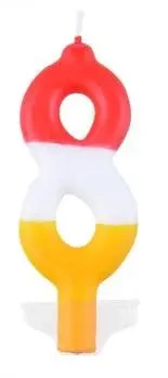 To unikalna, urodzinowa świeczka, która ma formę liczby 8. Wykonana jest z trichromatycznego wosku, dzięki czemu prezentuje się niezwykle atrakcyjnie. Wosk, z którego została stworzona, posiada trzy barwy: czerwoną, białą i żółtą. Całość tworzy efektowny, trójkolorowy efekt. Urodzinowa świeczka ma wysokość 10,5 cm, dzięki czemu idealnie spełni swoją rolę na urodzinowym torcie.