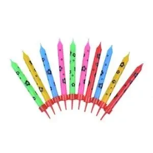 Radosne i kolorowe świeczki stworzone z myślą o dekoracji urodzinowego tortu. Długość każdej świeczki to 8 cm. W zestawie otrzymasz 10 efektownych świeczek, które uzupełnione są o stabilne podstawki.
