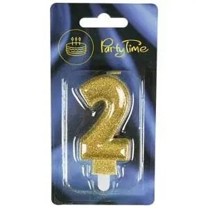Dekoracyjna świeczka w formie cyfry 2 o wykończeniu w złotym brokacie, kompletowana z praktyczną podstawką. Świeczka ma wysokość 7,5 cm.