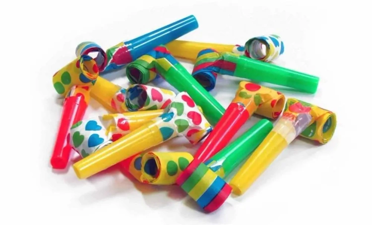 Prezentujemy zestaw składający się z trzech gwizdków wykonanych z papieru. Gwizdek po rozłożeniu ma rozmiar 2,5cm x 35cm.