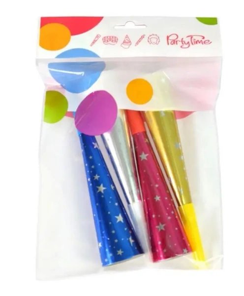 Zestaw składa się z czterech metalowych trąbek ozdobionych gwiazdkami. Każda z trąbek jest wyposażona w plastikowy ustnik i ma długość 20 cm. Trąbki są zapakowane w tuby wykonane z papieru, co nadaje im eleganckiego wyglądu. Doskonała zabawka na każdą okazję, czy to urodziny, sylwestrowe świętowania czy powitanie Nowego Roku. Trąbki są nie tylko praktycznym gadżetem, ale również świetnym elementem dekoracyjnym, dodającym uroczystego charakteru każdej imprezie.