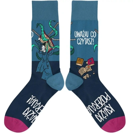 Jeśli myślisz, że tylko książki potrafią pochłaniać, to zastanów się jeszcze raz! Otóż, Skarpetki Wiedźma z książką także są w stanie pożerać, może niekoniecznie swych użytkowników, ale z pewnością ich wolne chwile. Uważaj więc, co czytasz i gdzie to robisz - te niezwykłe skarpetki będą stałym przypomnieniem o zaklętej księdze wiedźmy. Perfekcyjnie sprawdzą się nie tylko w roli osłony twoich stóp podczas czytania, ale także jako oryginalny prezent dla każdego mola książkowego. Kto nie marzył choć raz o posiadaniu tak magicznych skarpet?Charakterystyka Skarpetek Wiedźma z książką