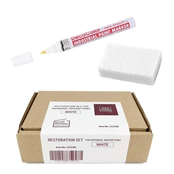 W skład zestawu wchodzi pumeks szlifierski, marker olejowy w kolorze białym oraz szczegółowa instrukcja użytkowania. Te trzy elementy razem stanowią niezbędny komplet, który pomoże Ci przeprowadzić proces renowacji inskrypcji na nagrobku.