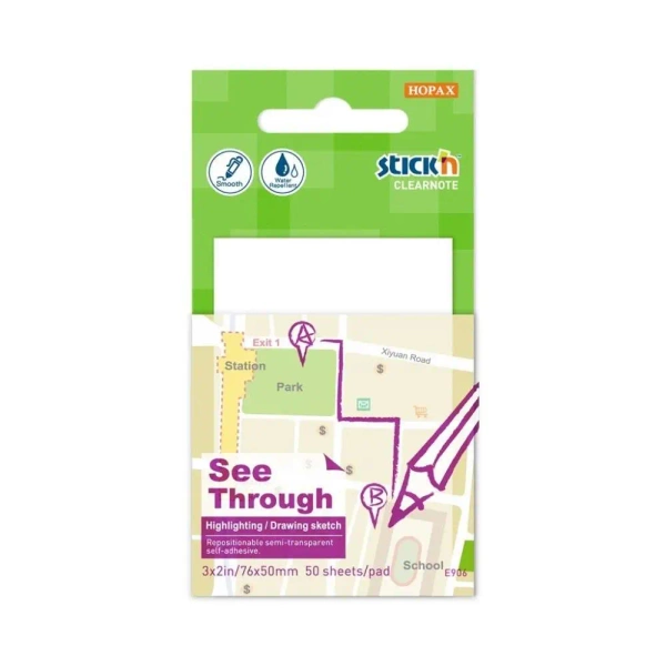 Prezentowany produkt to bezbarwny, a jednocześnie przezroczysty notes samoprzylepny. Jest on dostarczony z 50 karteczkami o wymiarach 51x76 mm.