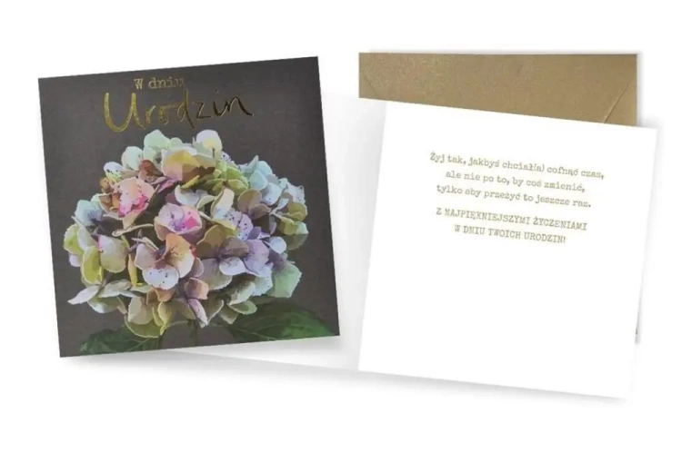 Pomyśl o niepowtarzalnej pamiątce w postaci urodzinowej kartki z serii Quadro. Złota folia dodaje tej kartce eleganckiego charakteru, a kwiatowy motyw na froncie sprawia, że staje się wyjątkowa. W każdej kartce QRP znajduje się miejsce na specjalne życzenia oraz możliwość dodania osobistej dedykacji.