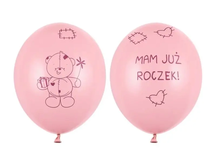 Prezentujemy Państwu balony Strong Miś - mam już roczek w delikatnym odcieniu Pastel Pink. Każdy z nich zdobi efektowny, czerwony nadruk przedstawiający sympatycznego misia oraz napis "mam już roczek", który umieszczony jest na trzech stronach balonika: z przodu, z tyłu oraz na górze. Każdy balon ma średnicę 30 centymetrów, co sprawia, że są one idealne do dekoracji wnętrz podczas uroczystości związanej z pierwszymi urodzinami malucha.