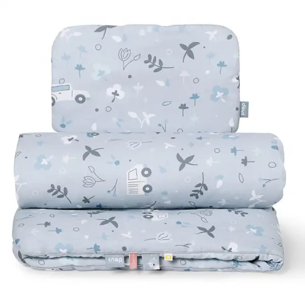 Komplet wykonany jest w 100% z wysokiej jakości bawełny satynowej, a jego wypełnienie to najlepsza gatunkowo antyalergiczna włóknina silikonowa. W celu zachowania optymalnych właściwości produktu, zaleca się pranie w pralce w temperaturze 30 °C i maksymalnie 800 obrotach wirowania, a także unikanie suszenia w suszarce bębnowej. Wymiary kołderki to 80x100 cm, natomiast poduszki 40x30 cm.