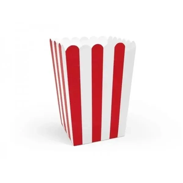 Prezentujemy zestaw czerwonych pudełek z białymi paskami, przeznaczonych do serwowania popcornu. Po złożeniu każde z nich ma wymiary około 7 x 7 x 12,5 cm. W jednym opakowaniu znajduje się sześć sztuk tych uroczych pudełek.
