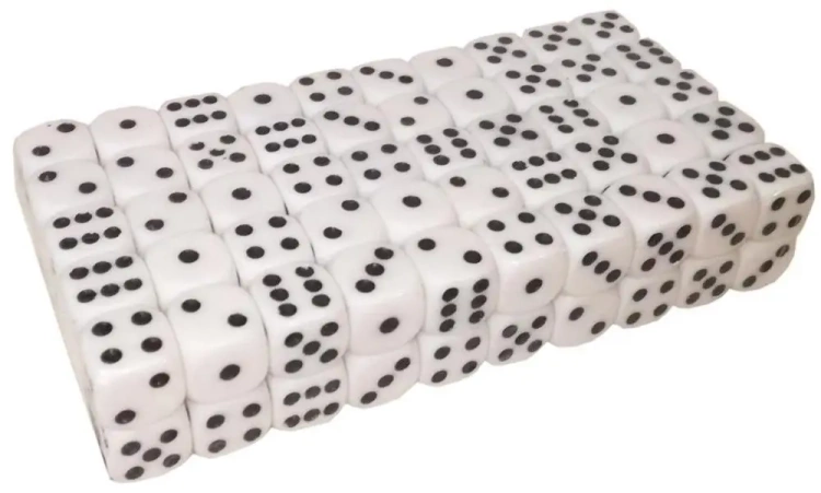 Zestaw składa się z 100 białych kostek do gry, które są ozdobione czarnymi punktami. Te kostki są niezastąpione podczas gier planszowych, ale również świetnie sprawdzą się w innych zastosowaniach. Charakteryzują się zaokrąglonymi rogami i krawędziami, co zwiększa ich wygodę użytkowania. Wyprodukowane są z trwałego, odpornego na uszkodzenia materiału, gwarantującego długą żywotność kostek.EAN: 5901353047900