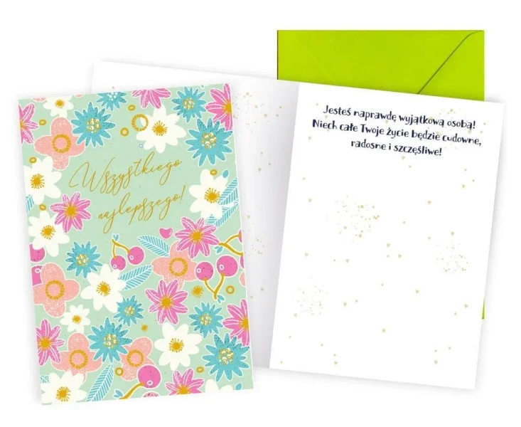 Wewnętrzna część kartki to kolorowe tło z unikalnym tekstem życzeń i przemyślaną grafiką. Każda kartka jest dostarczana z kolorystycznie dopasowaną kopertą, dzięki czemu tworzą one zgrany i estetyczny jej komplet.