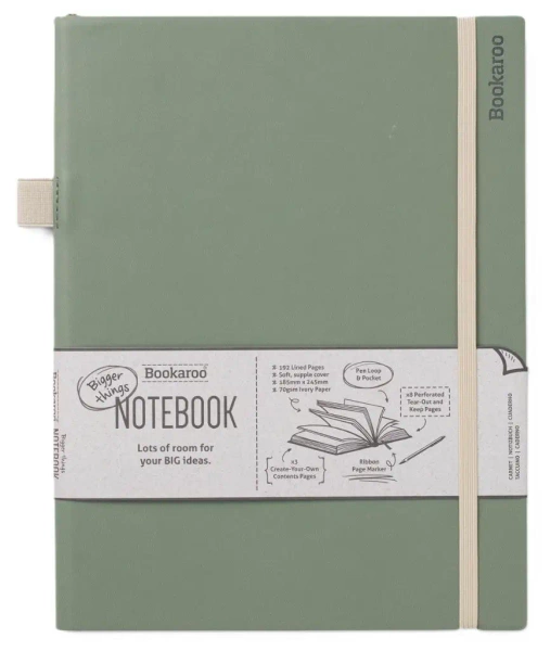 Bookaroo Journal to funkcjonalny, dekoracyjny notatnik o elastycznej okładce zielonego koloru. Wewnątrz czeka na Ciebie aż 192 kartki, z czego 8 oferuje możliwość łatwego oderwania dzięki perforacji.