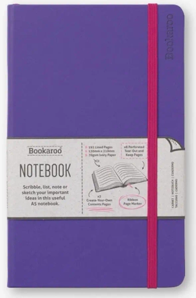 Prezentujemy Państwu elegancki notatnik Bookaroo zdobiony twardą, fioletową okładką. Zawiera w sobie 192 strony w linie, z których 8 jest wyposażonych w perforację dla łatwego wyrywania. Notatnik jest wykonany z papieru ośmiorniczej jakości, który charakteryzuje się ładnym kolorem kości słoniowej.