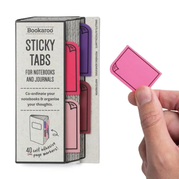 Prezentowany zestaw Bookaroo zawiera 40 samoprzylepnych znaczników, w czterech różnych kolorach (po 10 sztuk z każdego). Składa się na nie bezpieczny dla papieru klej, nie powodujący jego uszkodzenia, nawet gdy jest on znacznikami pokryty w notatnikach czy książkach. Znaczniki te są niezastąpione jako narzędzie wspomagające proces nauki.