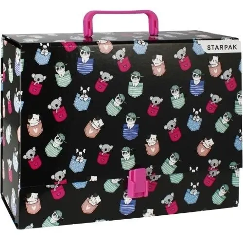 Prezentowany produkt to teczka A4 z rączką pochodząca z kolekcji Minisy marki STARPAK. Jest to model szczególnie solidny i wytrzymały, wykonany z grubego, lakierowanego kartonu. Wyposażony jest w zamykanie na praktyczny, plastikowy klips oraz posiada mocną rączkę.