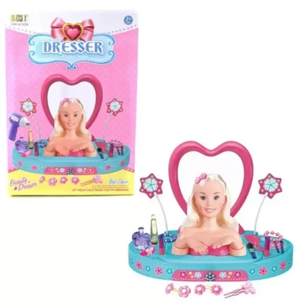 Prezentujemy idealny zestaw dla dzieci, które marzą o własnym salonie piękności: Toaletkę z lalką do ćwiczeń fryzur i makijażu. W pakiecie otrzymasz toaletkę z lusterkiem, lalkę z regulowanym popiersiem oraz akcesoria niezbędne do twórczych zabaw związanych z makijażem i fryzurami.