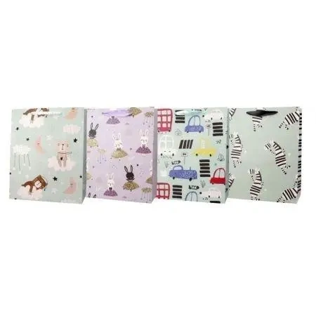 Te urocze torby na prezenty są tworzone z papieru o wysokiej jakości, który został uzupełniony satynowym, matowym wykończeniem. Zdobione są brokatem, co daje efektowny efekt końcowy. Wyposażone są w satynowe uchwyty, które dodają im elegancji. Mają także na sobie ładny, graficzny nadruk.