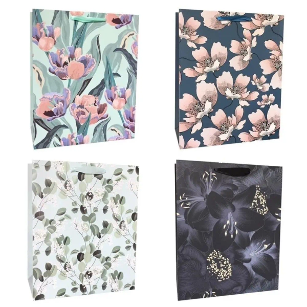 Elegancka torba prezentowa o wymiarach 26 x 32 cm, zdobiona motywem kwiatowym.