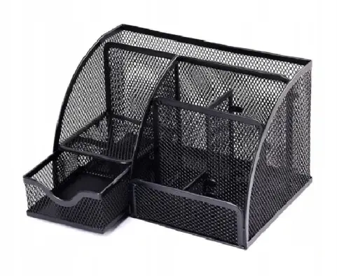 Przybornik czarny NET to stylowy, a zarazem niezwykle praktyczny produkt, wykonany z wysokiej jakości metalowej siateczki. Idealny dodatek do biura czy domowej przestrzeni pracy, który pozwoli utrzymać porządek w przyborach i narzędziach biurowych.