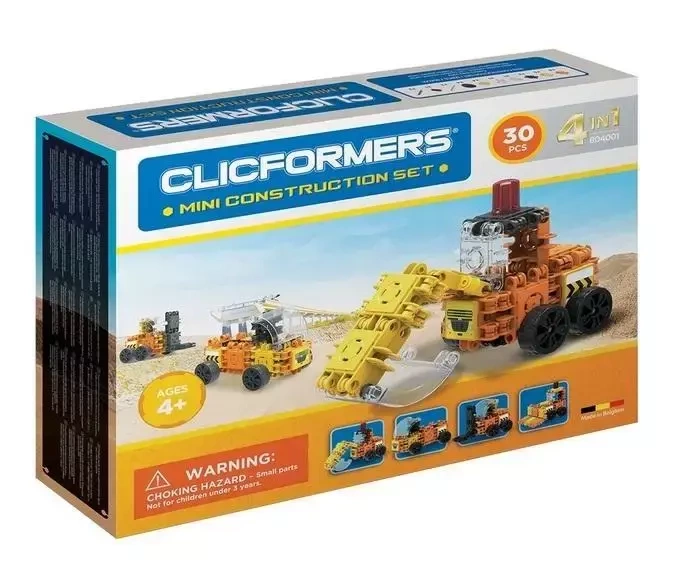 CLICFORMERS 4w1 to zestaw klocków konstrukcyjnych 30 elementów, który składa się z podstawowych części oraz niezwykle użytecznych akcesoriów. Dzięki nim dzieci mogą eksperymentować z budowaniem różnorodnych maszyn budowlanych.