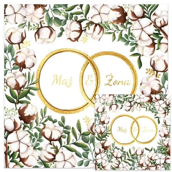Oferujemy niepowtarzalny karnet ślubny, o wymiarach 20 x 20 cm, który charakteryzuje się nie tylko oryginalnym kształtem, ale także eleganckim złoconym zdobieniem. Zawarte wewnątrz teksty życzeń zostały starannie wydrukowane na papierze najwyższej jakości.