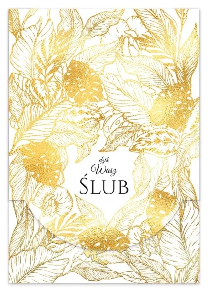 Prezentujemy Państwu elegancki karnet ślubny w formacie B6, który składa się w poziomie. Wyróżnia się on oryginalnym, złotym zdobieniem i tłoczeniami, a także wyszukanymi tekstami życzeń znajdującymi się w jego wnętrzu.
