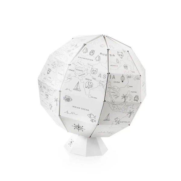 Ten papierowy globus przeznaczony do kreatywnego malowania i eksploracji, można łatwo złożyć i ozdobić, bez konieczności używania kleju. Dzięki solidnej podstawie, doskonale wpasuje się w wystój każdego pokoju dziecięcego.