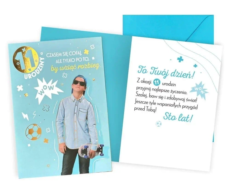 Uzupełnieniem całego zestawu jest koperta, która dopasowana jest kolorystycznie do samego karnetu. Ten oryginalnie zaprojektowany karnet to doskonały sposób na wyrażenie swoich urodzinowych życzeń dla jedenastolatka.