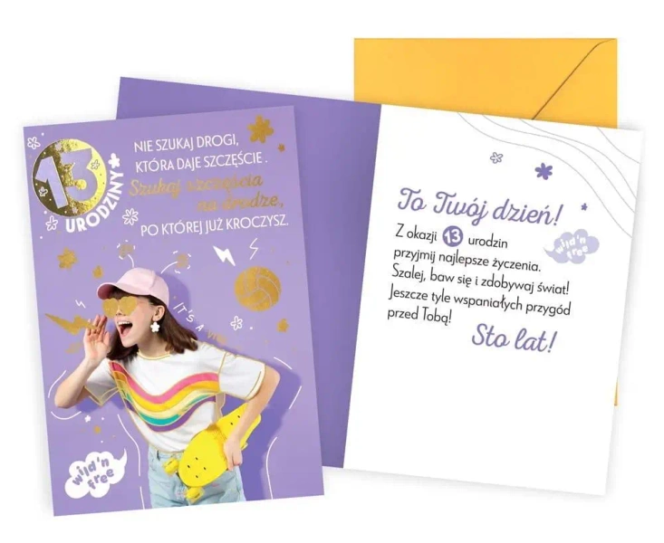 Wnętrze karnetu uświetnia tekst życzeń, dzięki czemu nie musisz wymyślać ich samodzielnie. Zupełnością tego produktu jest koloryzowany kufer, który idealnie komponuje się z całością karnetu. Wszystko to sprawia, że ten karnet to doskonały wybór na prezent dla 13-letniej dziewczynki na jej urodziny.
