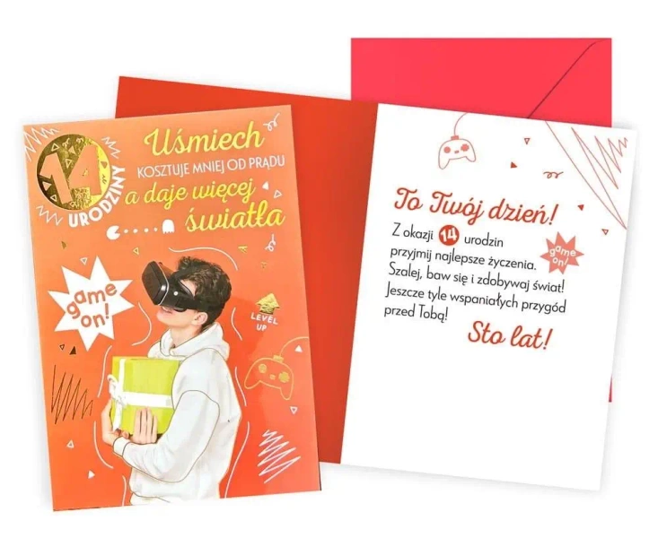 Karnet ten jest wykonany w dużej tzw. angielskiej wielkości 140x190 mm, co czyni go naprawdę wyjątkowym. Został stworzony z niespotykaną starannością dla detali, co jest zauważalne w każdym jego elemencie. Dopełnia go tekst życzeń zaprojektowany na środku, a wszystko to spowite jest w idealnie dobraną, kolorystyczną kopertą. Idealny na prezent dla chłopca na jego 14-te urodziny.