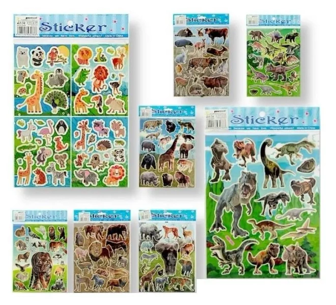 Naklejki z wizerunkiem zwierząt, stworzone za pomocą technologii laserowej, o wymiarach 20x25 mm.