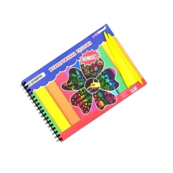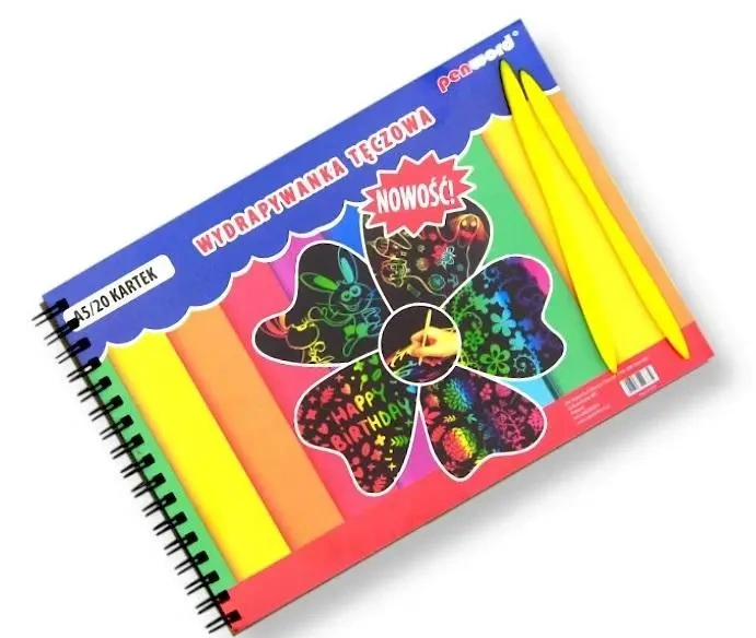 Prenzentujemy wyjątkowy produkt od firmy Penword - tęczową wydrapywankę. Produkt składa się z dwudziestu arkuszy, pokrytych czarnym pigmentem, które zamknięte są w praktyczną spiralę. Do zestawu dołączamy rysik, który posłuży do tworzenia niesamowitych obrazków.
