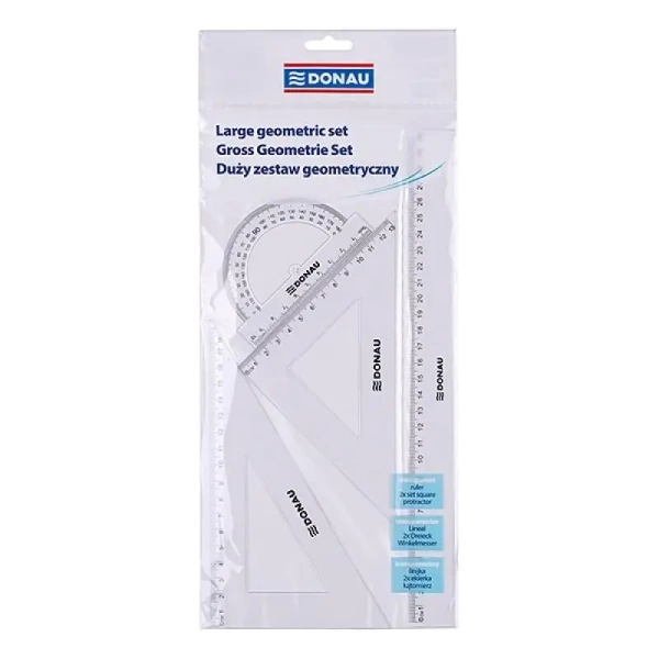 Donau prezentuje duży zestaw geometryczny, który okaże się niezwykle użyteczny dla uczniów na każdym poziomie edukacyjnym. Jego wysoce wytrzymała konstrukcja zapewnia odporność na odkształcenia, co gwarantuje jego długą żywotność. W zestawie znajdują się niezbędne narzędzia do nauki geometrii, w tym linijka 30cm, kątomierz oraz dwie ekierki o długości 13cm i 18cm. Narzędzia te są odpowiednio podzielone, spełniając wszystkie normy edukacyjne. Dodatkowym atutem zestawu jest jego przejrzysty kolor, który ułatwia manipulację i pomaga lepiej zrozumieć kształty i kąty. Ta niezbędna kolekcja przyrządów geometrycznych Donau to doskonałe narzędzie pomocnicze dla każdego ucznia, ułatwiające naukę i zrozumienie zasad geometrii.