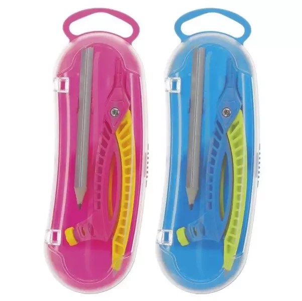 Prezentujemy dwuelementowy cyrkiel plastikowy, zaopatrzony w uchwyt na ołówek. Komplet zawiera dodatkowo ołówek, a całość zamknięta jest w praktycznym etui z tworzywa sztucznego.