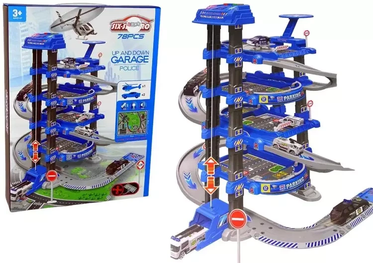 Zestaw, składający się z 78 elementów, wymaga od dzieci cierpliwości i skupienia, dając jednocześnie dużo satysfakcji. Znajdują się tu m.in. dwa samochody policyjne, samolot, oraz mechanizm windy z dźwiękami,? której główną funkcją jest transport pojazdów na wyższe poziomy parkingu. Wyniesienie autka na najwyższą kondygnację jest proste, wystarczy nacisnąć żółty przycisk i winda zrobi to za nas.