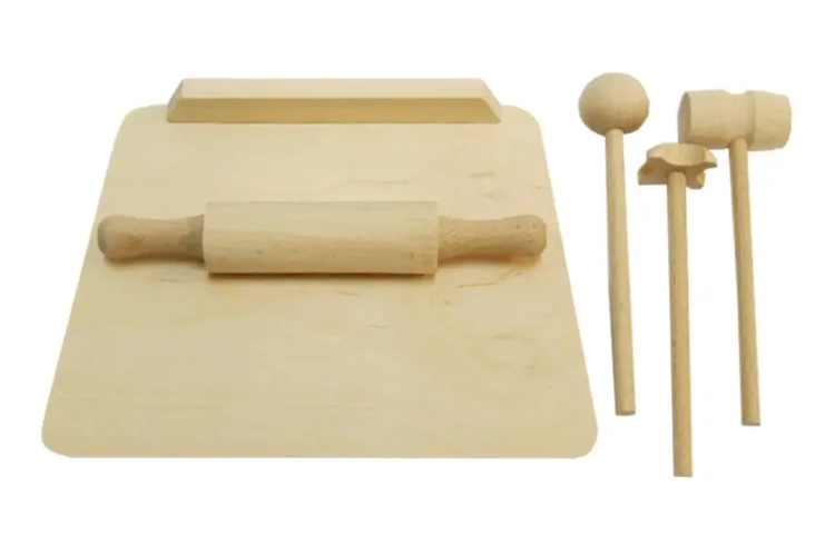 Drewniana stolnica z akcesoriami kuchennymi