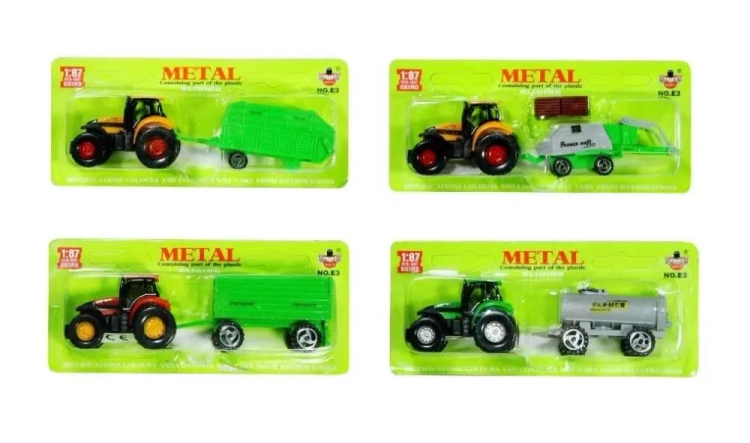 Jest to traktor wytworzony z połączenia tworzywa sztucznego i metalu, który posiada przyczepę. Co więcej, istnieje możliwość przymocowania do niego dodatkowej przyczepy. Produkt jest dostępny w wielu wariantach kolorystycznych, które są wybierane w sposób przypadkowy. Uwaga: Cenę podaje się za jedną sztukę. Traktor jest starannie zapakowany w kartonową podstawkę zabezpieczoną przezroczystym kloszem. Podane rozmiary odnoszą się do rozmiarów opakowania.Kolorystyka produktu