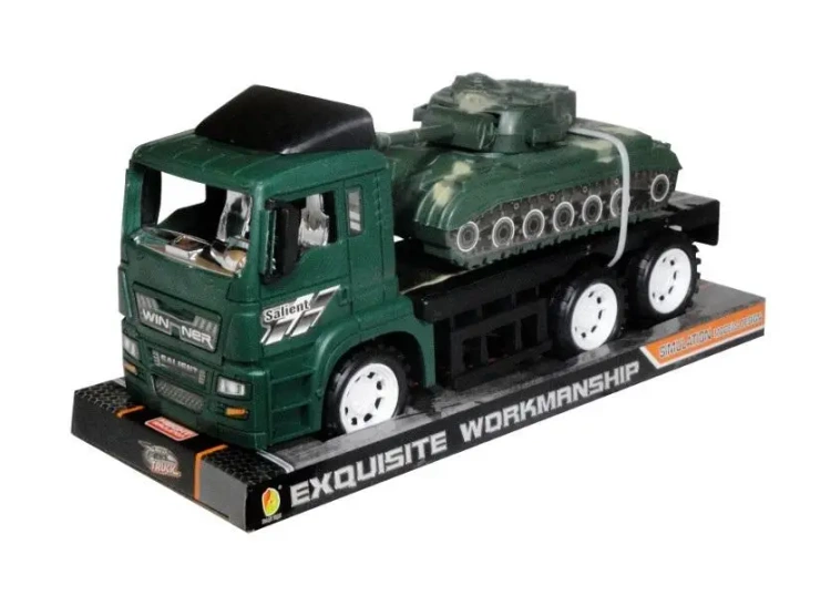 Zestaw składa się z ciężarówki oraz czołgu wyprodukowany z plastiku, idealnie nadający się na potyczki w maluchów w żołnierzyków. Obiekt jest starannie zapakowany na kartonowym podkładzie zestawionym z przezroczystym kloszem.Polecamy ten produkt dla maluchów, którzy ukończyli trzeci rok życia.
