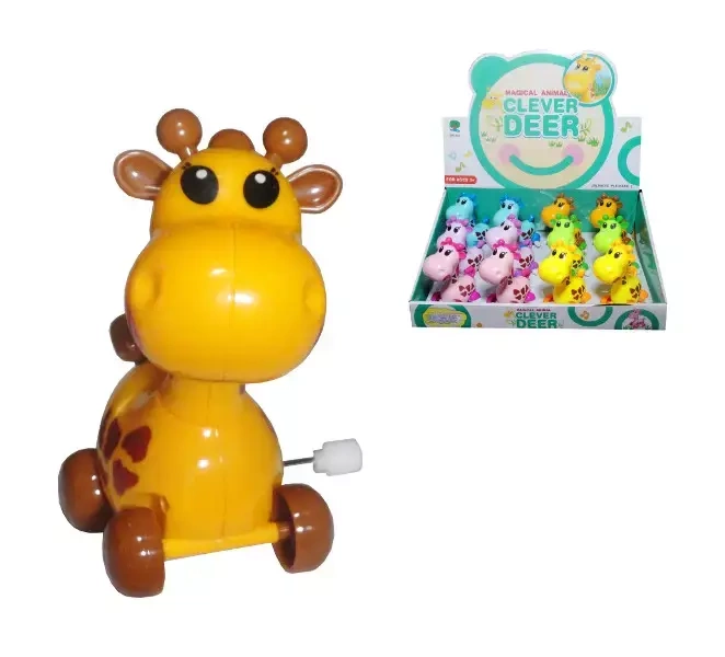 Zabawka żyrafa do nakręcania. Po nakręceniu porusza się do przodu, a także porusza ogonkiem (prawo lewo) i głową (prawo lewo). Głową i ogonem porusza naprzemiennie tzn jeśli głowa obraca się w prawo to ogon w lewo.
