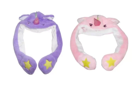 Pluszowa czapka dla dzieci jednorożec z uszami. Po naciśnięciu końcówki łapki uszy podnoszą się do góry.