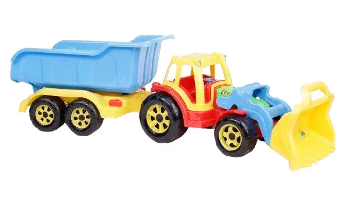 Kolorowy, plastikowy traktor z doczepianą do haku z tyłu traktora przyczepą. Super traktor do zabawy w małego rolnika. Idealny do zabaw w piaskownicy. Zabawka dostarczy dziecku dużo radości i satysfakcji z zabawy przez długi czas.