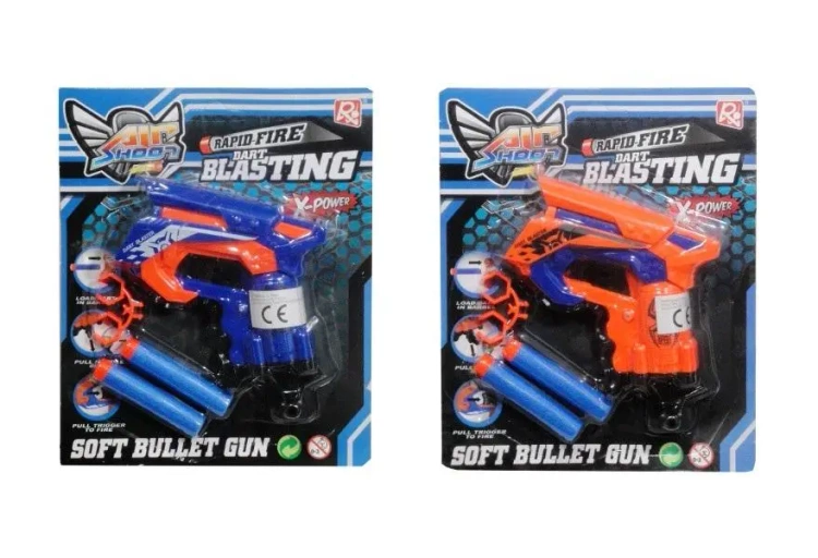 Zabawkowy pistolet na pociski, wykonany z wytrzymałego plastiku.Produkt sprzedawany jest w estetycznym opakowaniu, którym jest kartonowa podstawka przykryta przezroczystym wieczkiem.