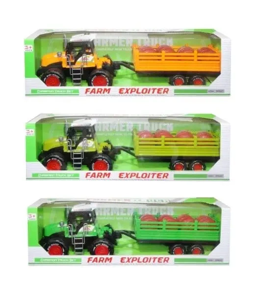 Traktor z beczkami z przyczepą będący zabawką na napęd cierny