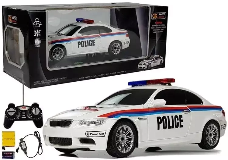 W skład zestawu wchodzą: białe policyjne autko, pilot R/C, baterie do zasilania autka i kabel USB. Pilot z czarnymi i srebrnymi elementami posiada przyciski, dzięki którym dziecko będzie mogło sterować radiowozem - poruszać nim do przodu, tyłu, w prawo i w lewo.