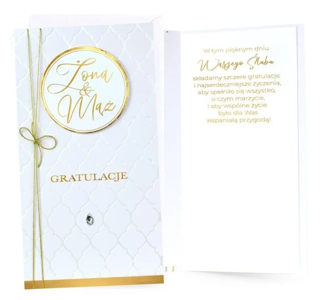 Wielkim atutem jest również dopasowana kolorystycznie koperta - wszystko tworzy niezwykle spójny cały. Dajemy Ci produkt gotowy do wręczenia. To idealne rozwiązanie, gdy chcemy wręczyć coś niepowtarzalnego na wyjątkową okazję, jakim jest ślub.