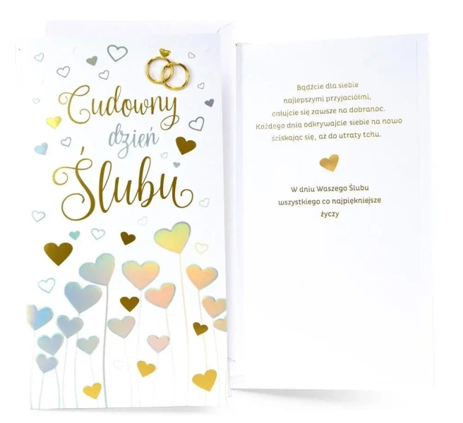 Zdobią je różnorodne elementy, w tym folie złote, srebrne, perłowe oraz holograficzne. Dodatkowo urozmaicone są biżuteryjnymi naklejkami, tasiemkami, brokatem oraz laserowymi wykrojami. Każdy wzór ma swoje unikalne detale, które dodają mu wyjątkowej elegancji. Wnętrze każdego karnetu również nie jest pominięte - znajdziemy tam wyrafinowaną grafikę oraz miłe słowa życzeń.